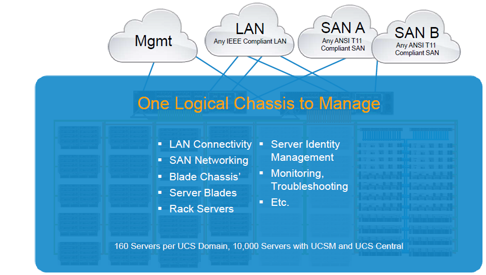 5- Cisco UCS ® Manager: وهو نقطة الادارة المركزية للنظام ككل ويستطيع ادارة عدد من السيرفرات الوهمية والفيزيائية وصولاً الى 160 سيرفر.